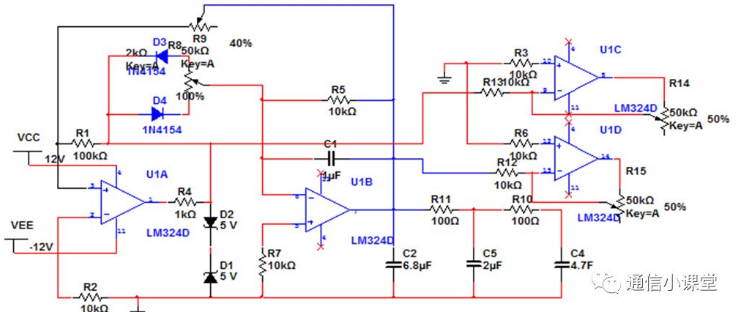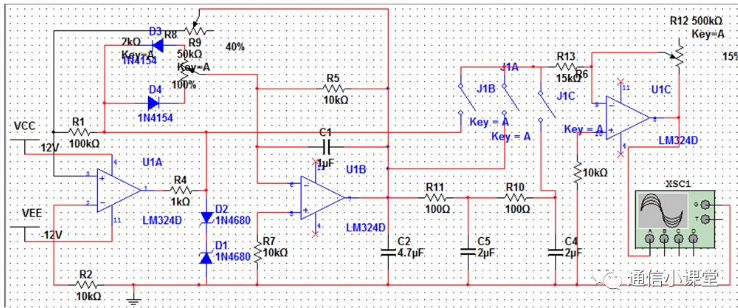 设计要求:输入+—12v电压,产生5v,1khz的正弦波,方波,三角波,锯齿波,并通过按键依次切换。