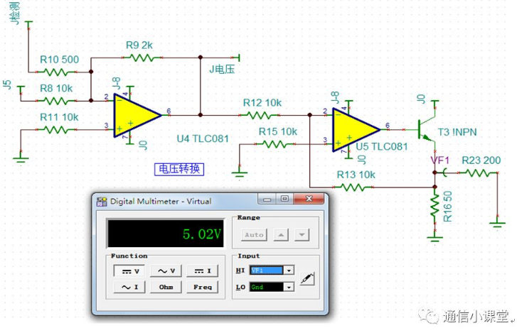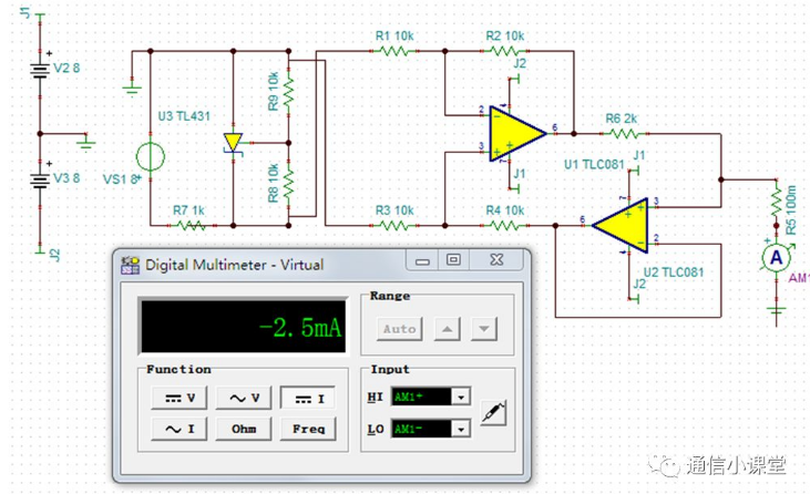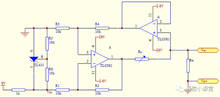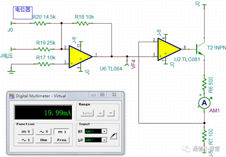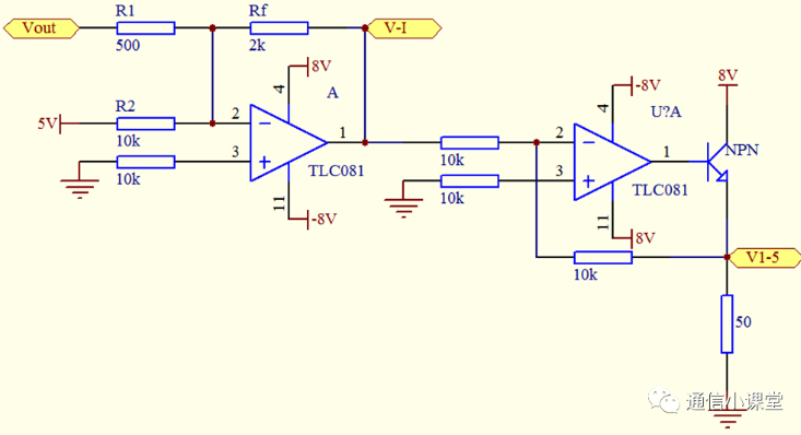 两个运放TLC081均引入了负反馈,前者构成同相求和运算电路,后者构成电压跟随器。根据虚短、虚断原理,若取R1=R3,R2=R4,则输出电流Iout=