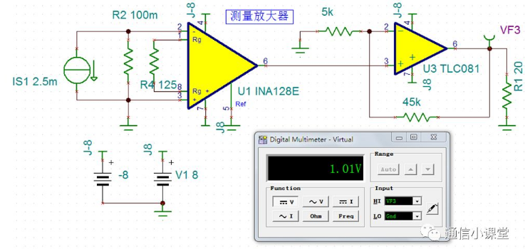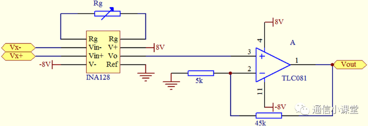 测量放大器可以用若干普通运放搭建,也有专门的IC。从简化设计的角度考虑,选用Ina128这款低功耗、高精度的通用仪表放大器。该芯片外围电路简单,可实现1-10000的任意增益。
