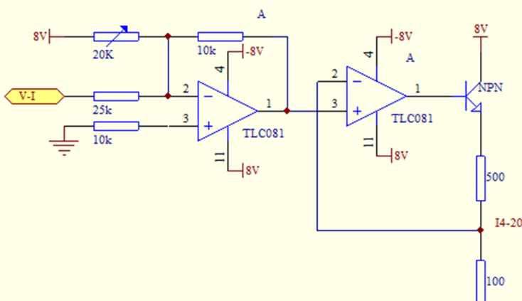 4-20mA也是仪表的标准输出,它可由1-5V输出电压经过V-I电路得到。也可以把1-5V电压加在一个250Ω的电阻两端后得到。相对来说,后者电路更简单。但为了保证电路的驱动能力,本设计采用V-I电路。