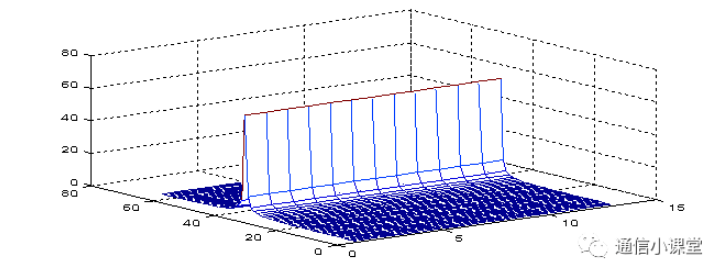 以13位巴克码为例,仿真参数:ADC采样频率=40MHz,二相码的码元宽度0.2us,即一个码元采样8点,脉冲重复周期PRT为7.8us,脉冲重复频率PRF=1/PRT,MTD积累的脉冲周期数M=64,雷达工作波长2cm,多普勒频率=200kHz,因为,且脉冲周期数M=64,所以在DDC及MTD后出现在多普勒通道号为37的多普勒通道上,如图3所示(无噪声)。